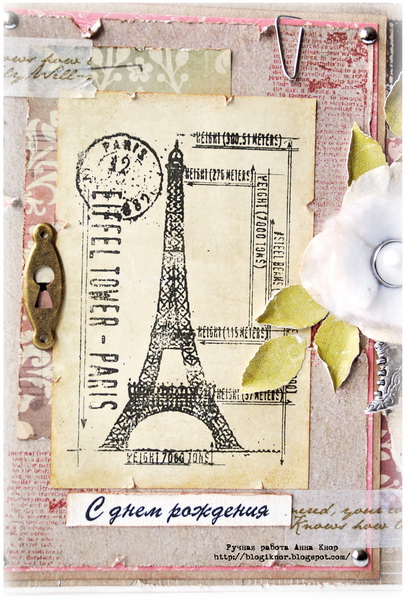 Пришла показать открытку "Париж". Очень давно ничего не делала по заданиям блогов, где я не являюсь дизайнером. Так что весна плодотворно на меня влияет))))